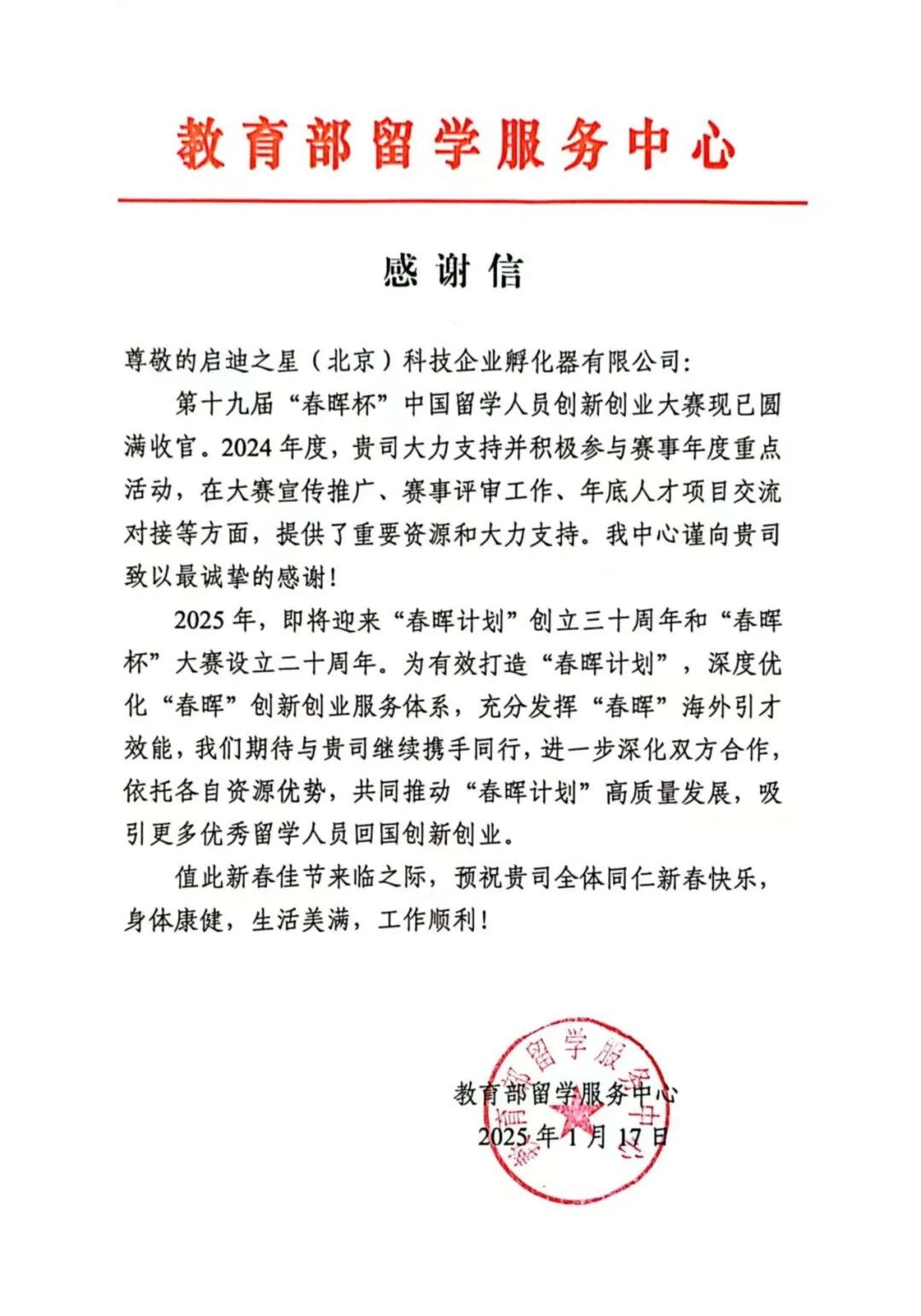 近日,教育部留学服务中心向启迪之星致以感谢信,感谢启迪之星对第十九届“春晖杯”中国留学人员创新创业大赛的支持。