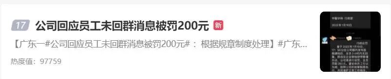 网传图片显示,在广东某公司内部聊天群内,相关人员发布了一条行政处罚消息,称鉴于2022年1月10日17:56分,在公司群内发布放假通知后,全员2小时内无回复,即违反企业微信使用管理办法,公司将进行惩罚,全员罚200元。