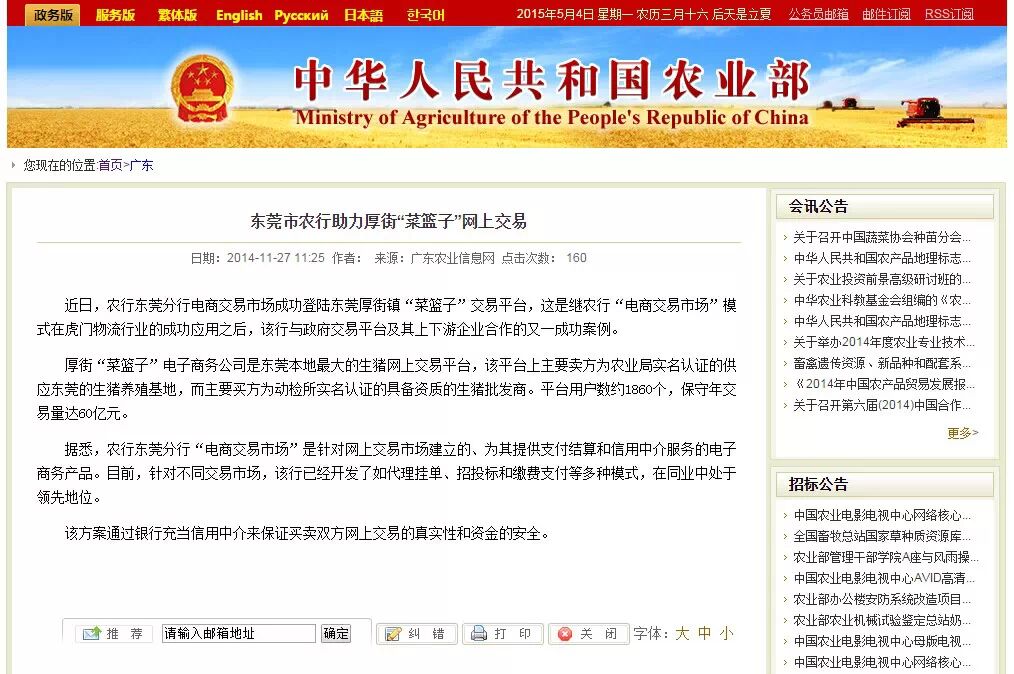。。平台已与农业银行系统对接,菜篮子交易平台方案通过农行充当信用中介来保证买卖双方网上交易的真实性和资金的安全。