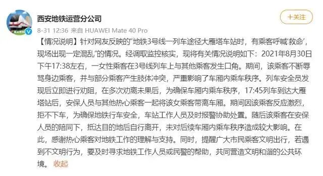 8月31日中午,西安地铁运营分公司发布情况说明称,8月30日下午,一女性乘客在3号线行驶的车厢内与其他乘客发生口角。其间,其不停辱骂身边乘客并产生肢体冲突,严重影响乘车秩序。下午5时45分,在车辆抵达大雁塔站后,站内工作人员和热心乘客对其劝阻并试图将她带离车厢。其间因该乘客反应激烈,拒不下车,为确保地铁行车安全,车站工作人员及时报警协助处置。随后该乘客在安保人员的陪同下,抵达目的地后自行离开,未对后续车厢内乘车秩序造成较大影响。