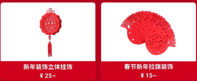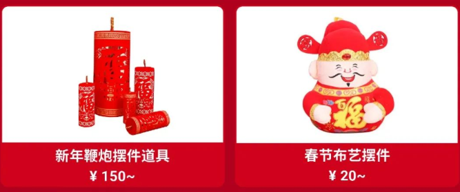 除了“福”字和对联外,各种红彤彤的灯笼挂饰和拉旗装饰、春节相关的摆件也成大量东南亚用户的寻找对象的,相关关键词也会迅猛飞涨,如“春节”、“福”、“装饰”、“摆件”等字眼,推荐用户上新时可以使用这些类似的字眼提高曝光。其中摆件,近年来为了方便环保,更多年轻人会倾向直接选择购买春节布艺摆件,比如财神爷、金桔树和桃树等等,不仅能重复利用,而且不需打扫清理,过节氛围满满还省时省力!各种仿真的新年鞭炮摆件道具也受消费者喜爱。