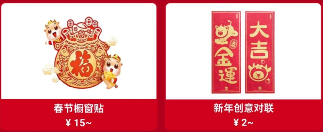 其中一个大类是“福”字橱窗贴/门贴、中国特色的对联等带有浓厚节日氛围的装饰品。根据消费者的喜好,“福”字贴图可精细化到各种图案,比如福“倒”、鲤鱼跳龙门、五谷丰登、龙凤呈祥等。而对联除了传统样式外,还可选择上新,如下图所示的创意对联,更受年轻消费者喜爱!样式上除了毛笔字,还可以采用烫金工艺,表现形式上也可以加入卡通绘画和网络热词。