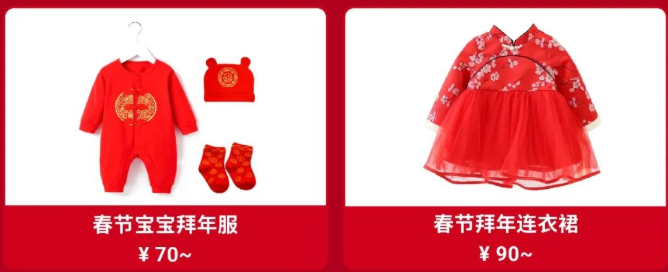 春节当天,父母们在带着孩子拜访长辈前,都会将孩子精心打扮一番,男孩穿上红红火火的拜年服;女孩穿上漂漂亮亮的连衣裙。各种可爱的新衣服当然不可错过,女孩裙子、男孩长裤、婴幼儿连体衣,儿童服饰安排上,单量涨涨涨!