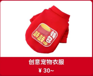 人们在欢庆春节的时候,都是齐家欢庆,所以家中萌宠也少不了!各种充满春节的气息的宠物衣服借此机会上新,其中符合年轻人趣味的“钱包鼓鼓”、“一夜暴富”等创意文字的服饰秒获年轻人欢心。