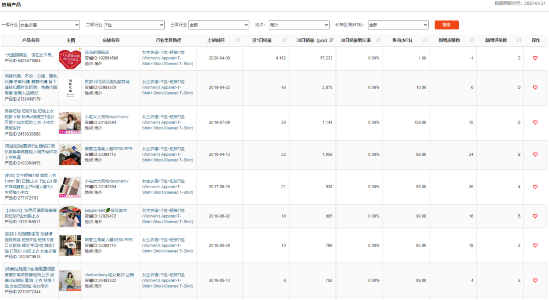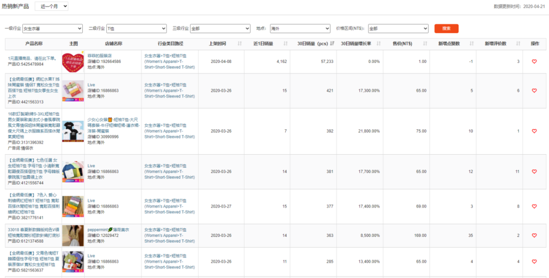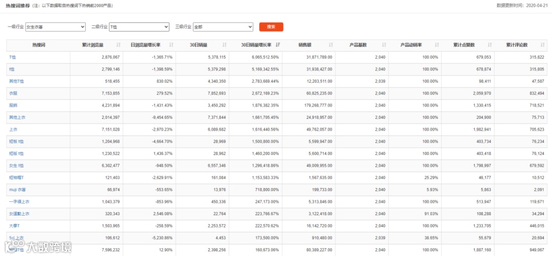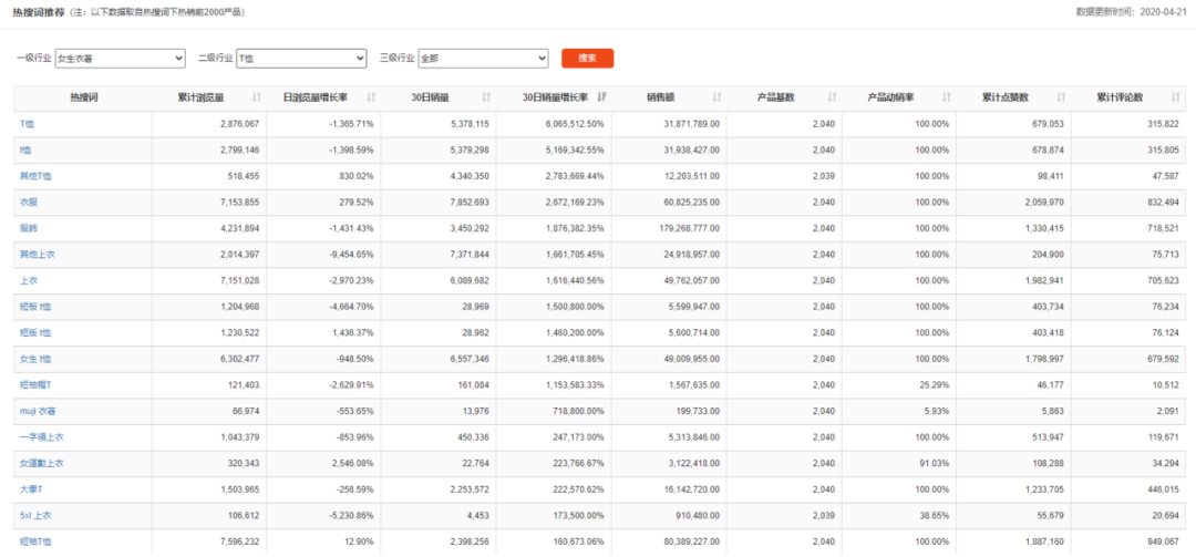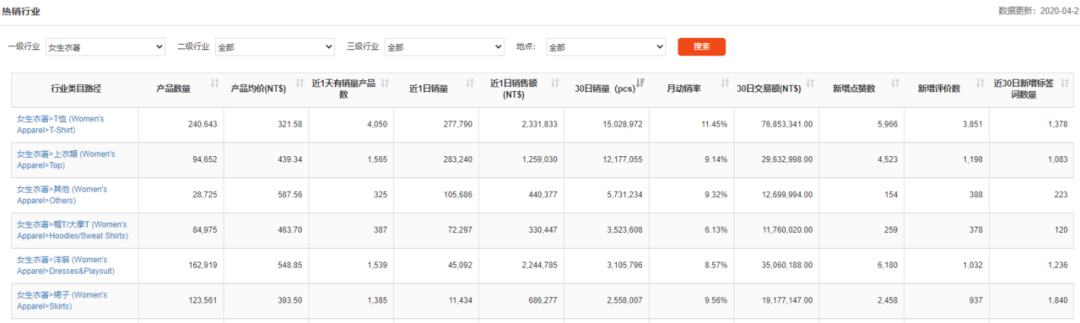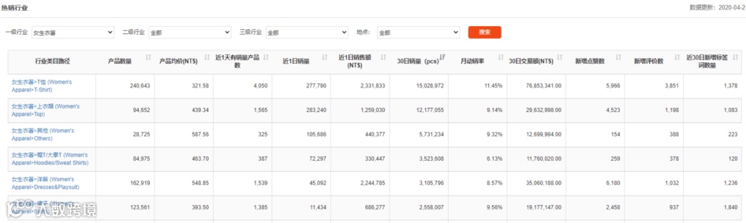 我们选择一级行业设置女生衣着,点击30日销量排序,可以查看到女装类目下二级类目最热销的是T恤。