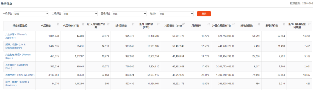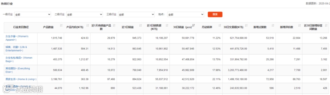 以中国台湾站点为例,销量最高的类目是女装,其次是娱乐,再者是包包。