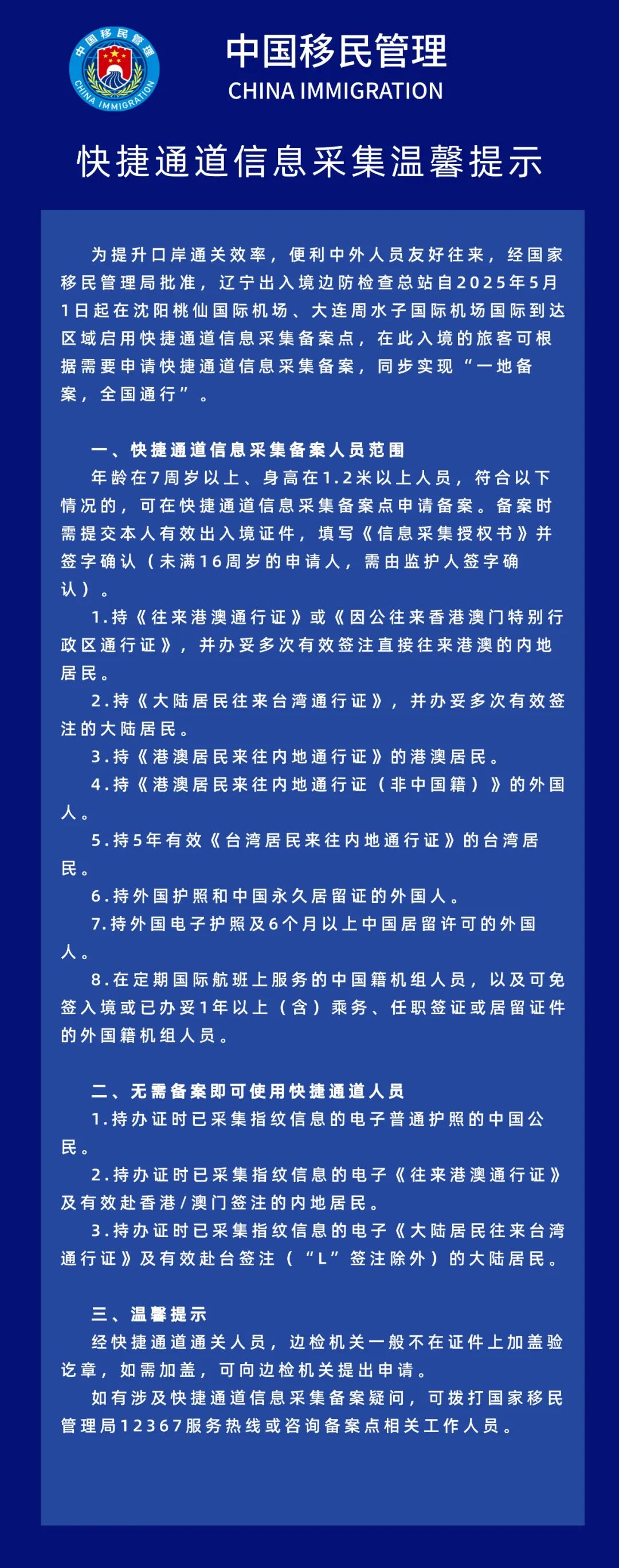 为提升口岸通关效率,便利中外人员友好往来,经国家移民管理局批准,辽宁出入境边防检查总站自2025年5月1日起在沈阳桃仙国际机场、大连周水子国际机场国际到达区域启用快捷通道信息采集备案点,在此入境的旅客可根据需要申请快捷通道信息采集备案,同步实现“一地备案,全国通行”。