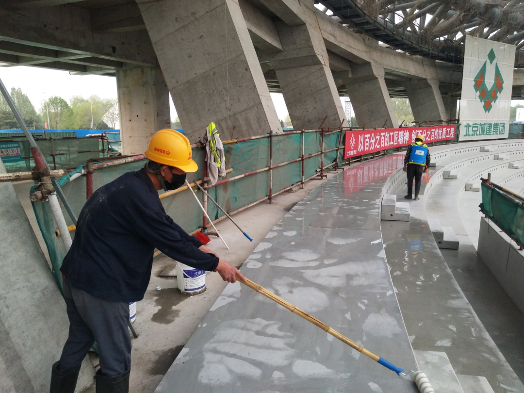 ▲冬奥场馆“冰丝带”建设时,工人正在使用佳固士的产品进行防水处理