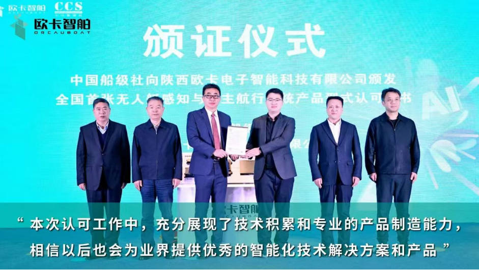 欧卡智舶的智舶系统获得由中国船级社颁发的全国首个《无人艇感知和自主航行系统》型式认可证书。