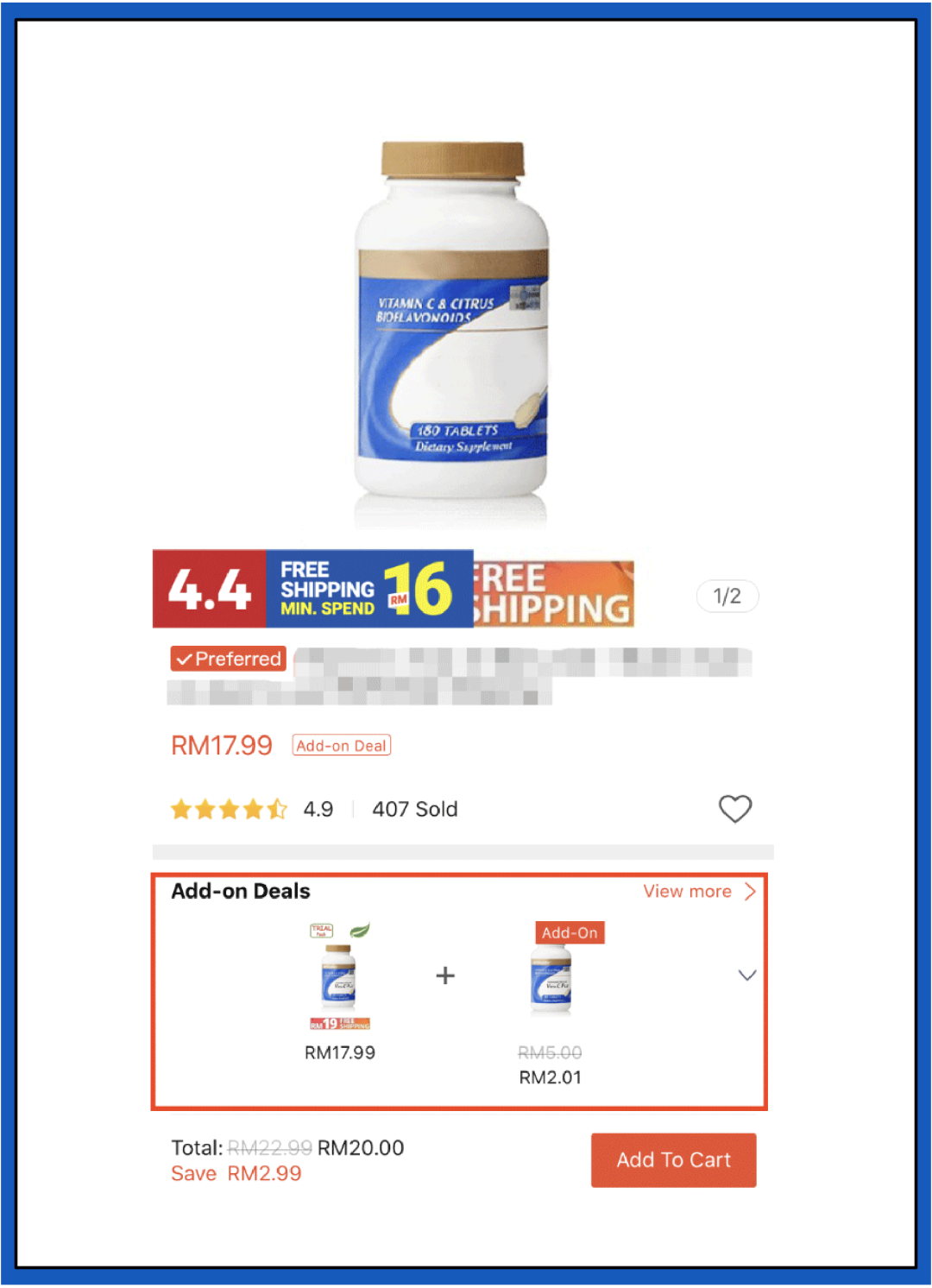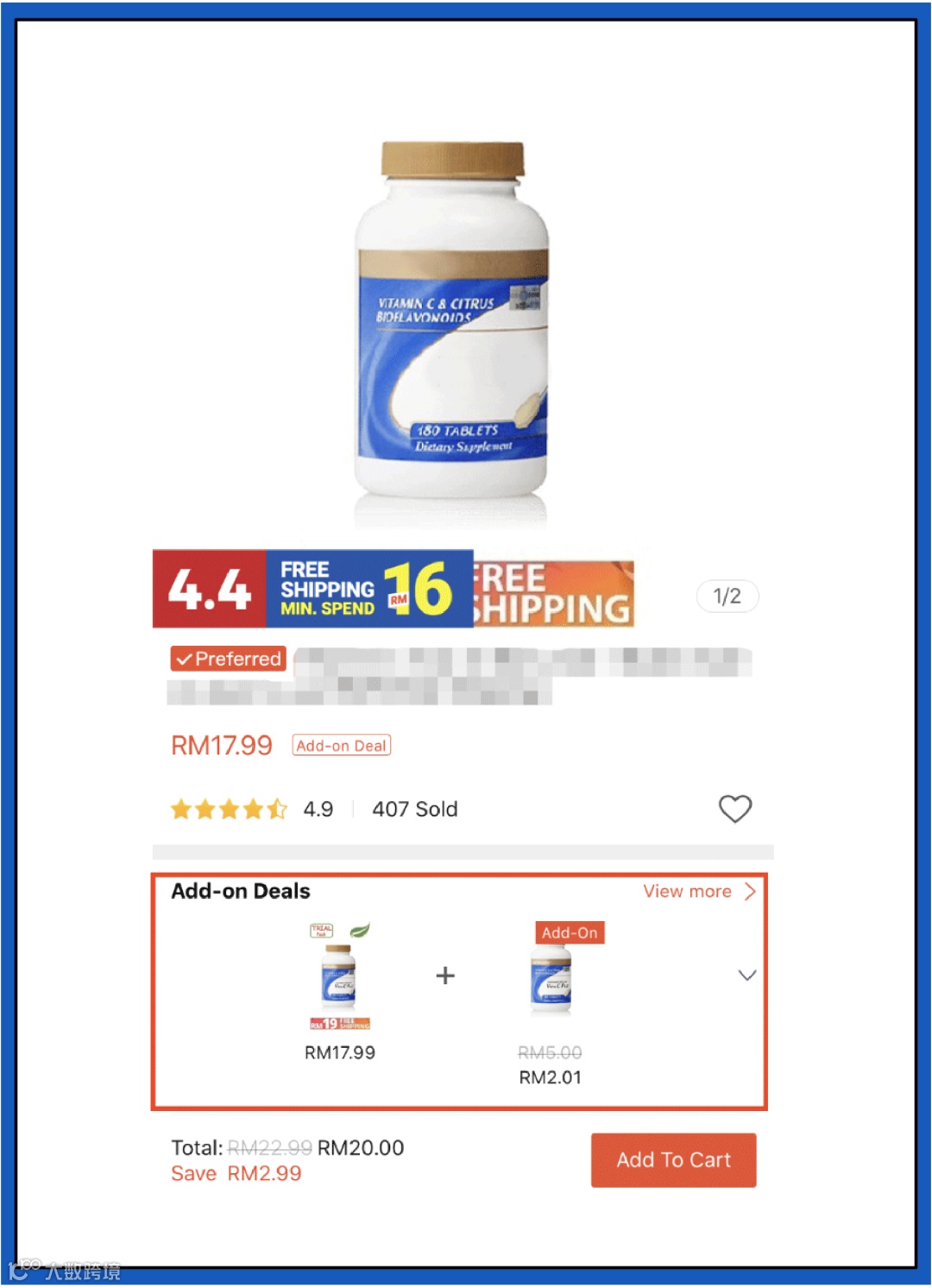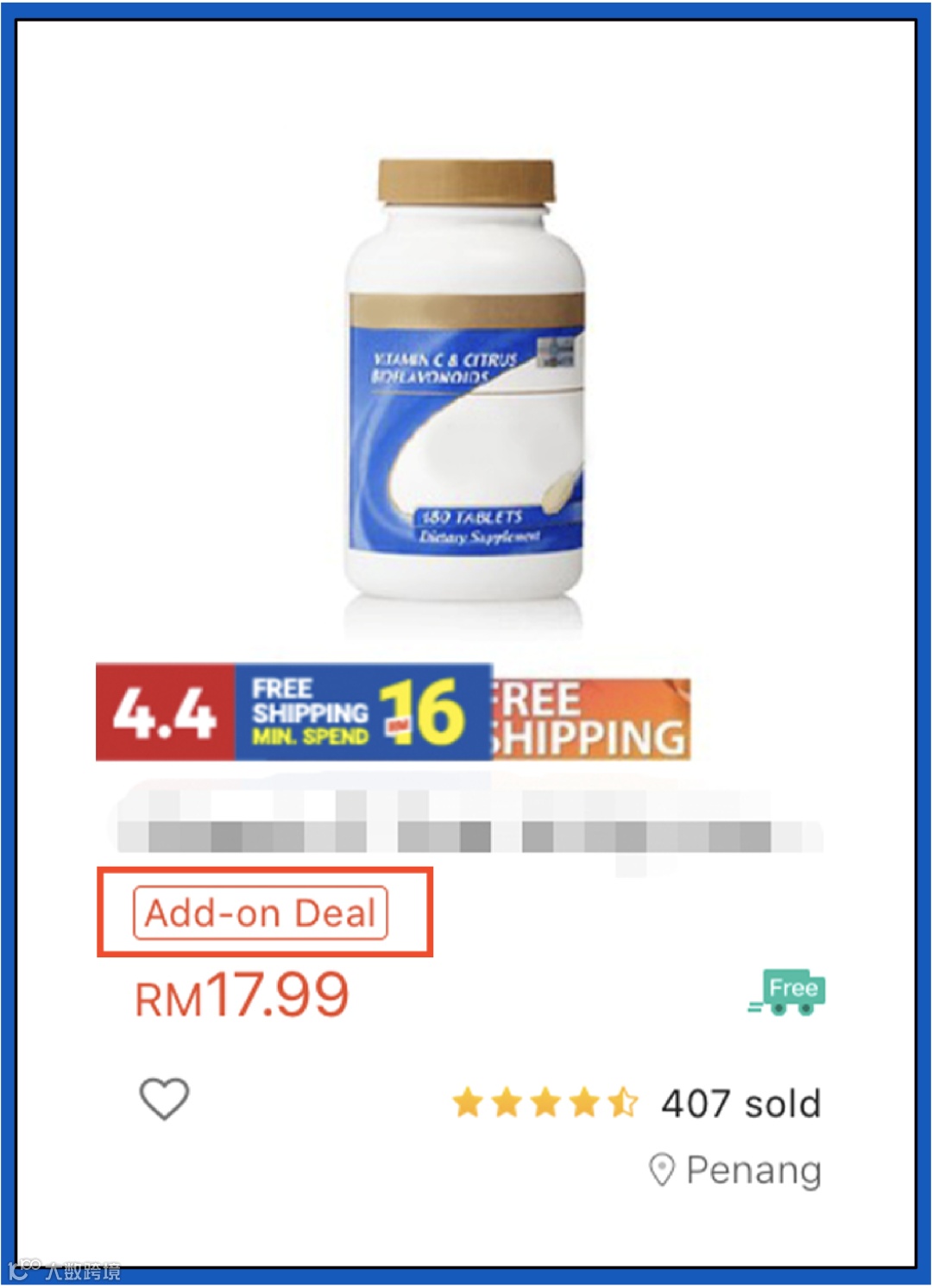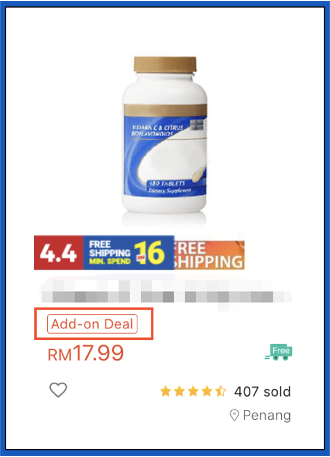 加购优惠(Add-on Deal)会以醒目的标签出现在Shopee App商品浏览页上,让买家在纷繁的商品堆里一眼看见那个优惠的“它”。