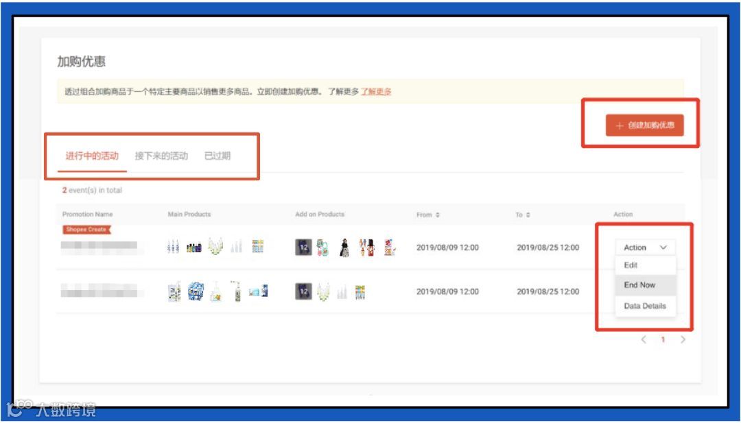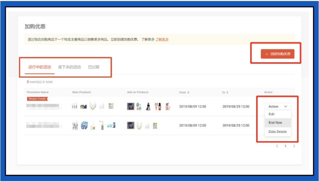 进入后,您可以创建、编辑或结束正在进行或即将开始的加购优惠,但已过期或由Shopee创建(带有橙色标签)的加购优惠无法进行编辑。