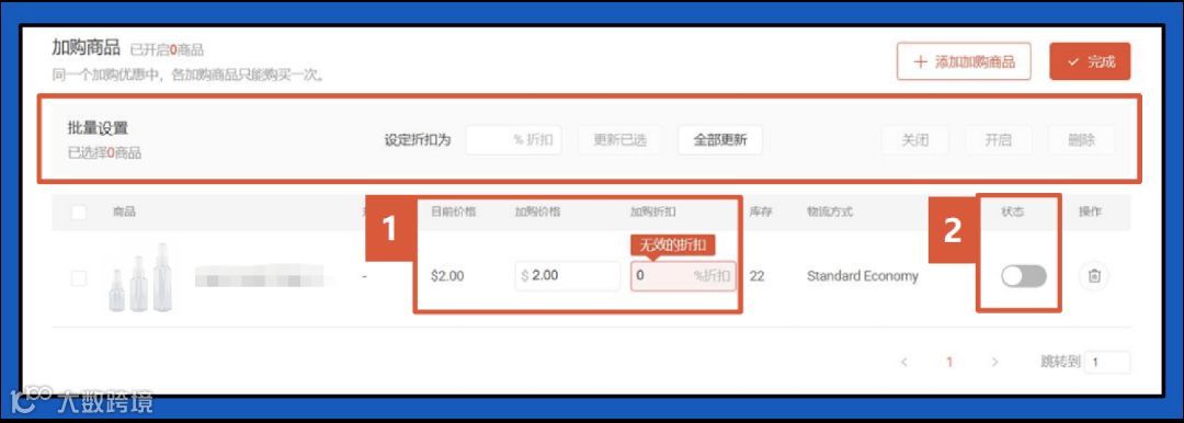 您可以选择100种加购商品,只要买家购买了主要商品,即可使用您设定好的折扣价格购买加购商品。选择确认后,输入①商品价格及加购优惠,并点击②状态切换按钮来激活加购商品。