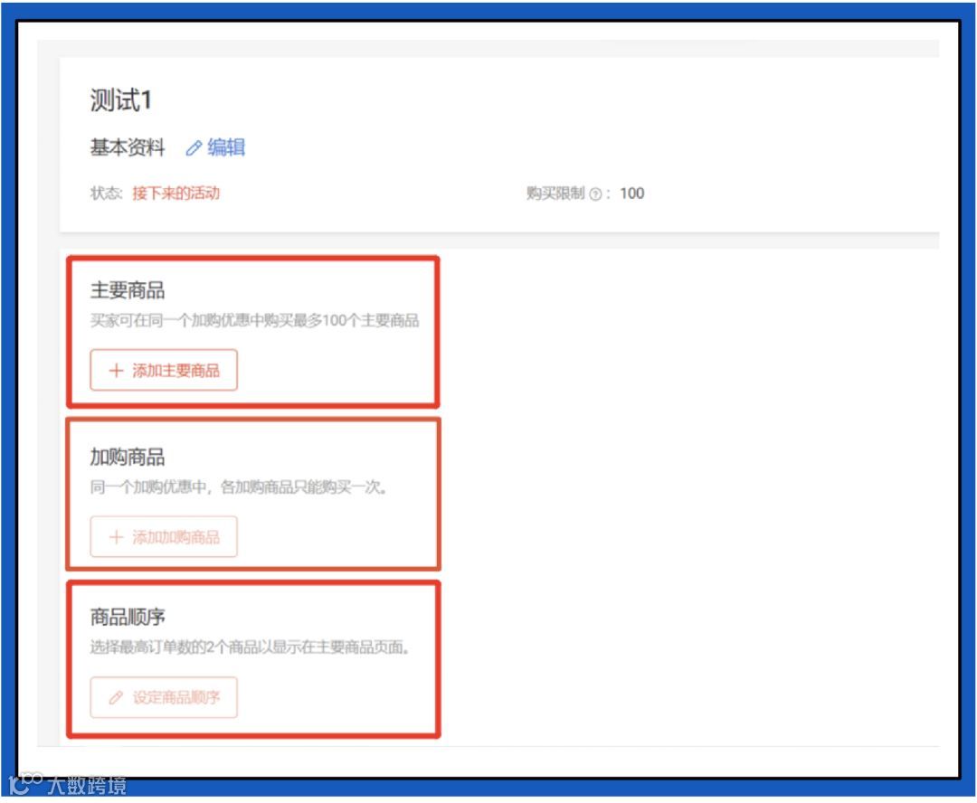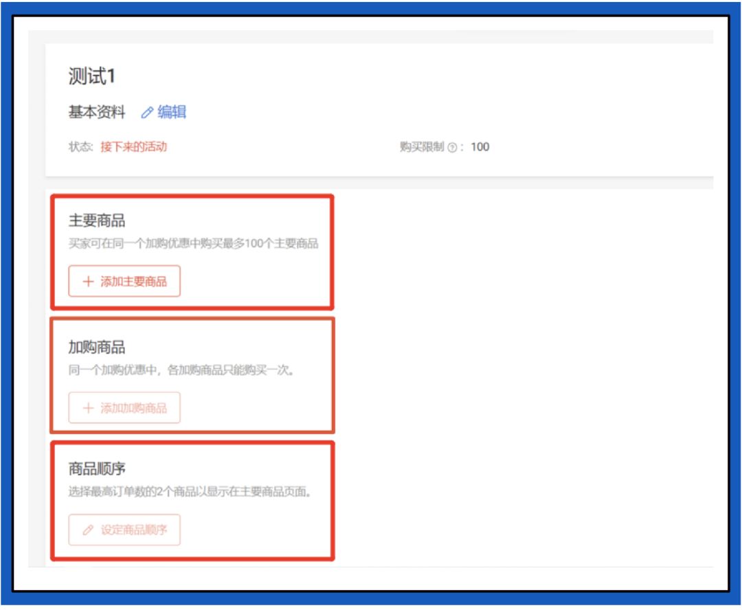 接下来,您就可以按顺序,分别设置本次架构优惠活动的主要商品、加购商品及商品顺序。