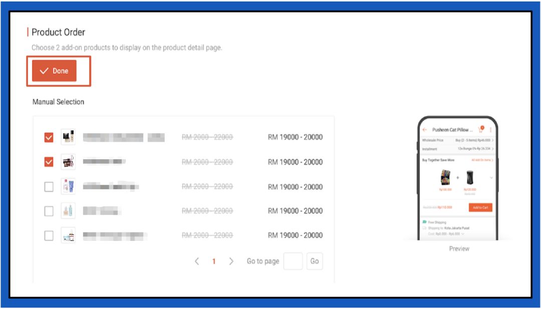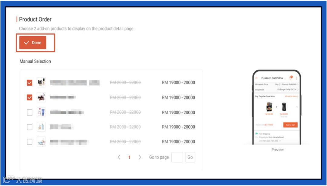 最后可以选择两个加购商品与您的主要商品页面一起展示,当买家在浏览您的商品时就可以第一时间发现您选定展示的加购商品(系统默认优先展示订单最多的前两个商品)。