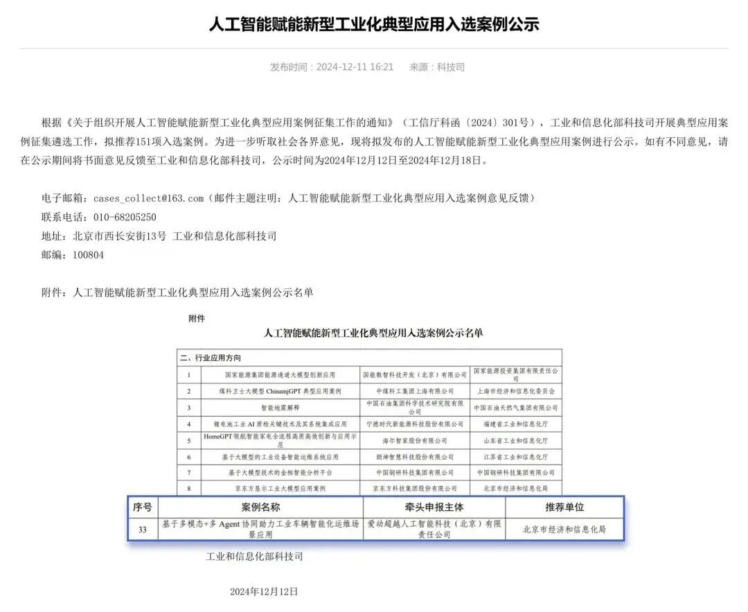 爱动超越凭借其“基于多模态+多Agent协同助力工业车辆智能化运维场景应用”成功入选工业和信息化部科技司《人工智能赋能新型工业化典型应用入选案例公示名单》。