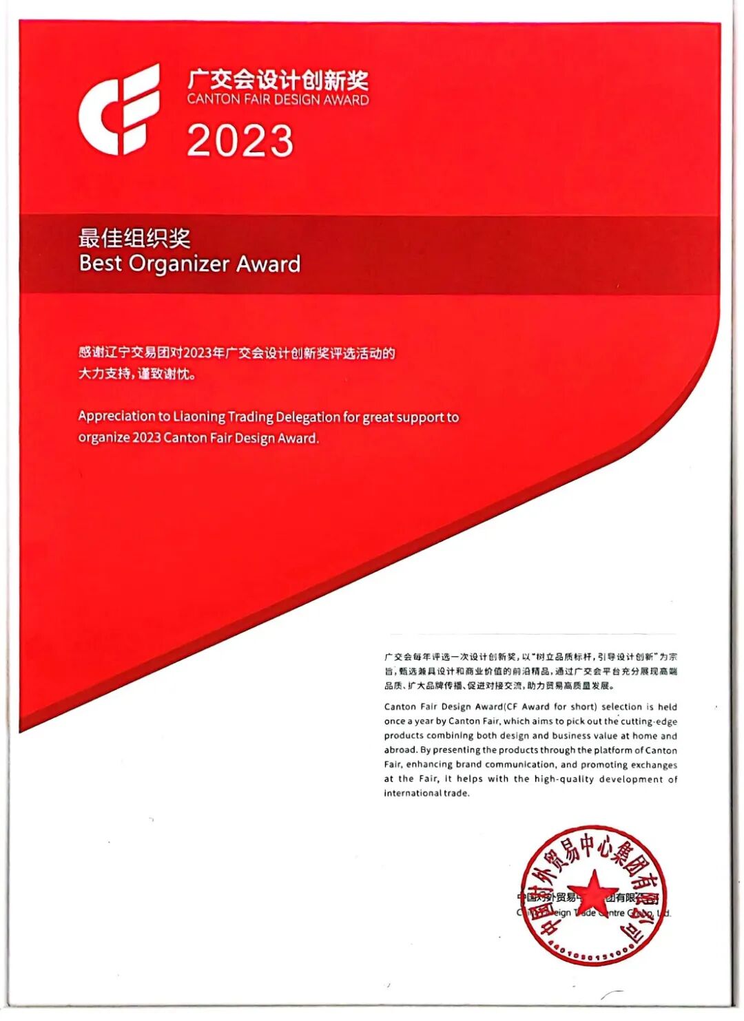 广交会出口产品设计奖(CF奖)设立于2013年首次举办,每年评选一次,由中国对外贸易中心主办,旨在不断促进企业提升研发创新能力,培育形成外贸竞争新优势,最终推动中国外贸发展方式转变。2023年CF奖共2284件参评,最终141件产品脱颖而出。除了产品奖项,全国共10家交易团荣获最佳组织奖。