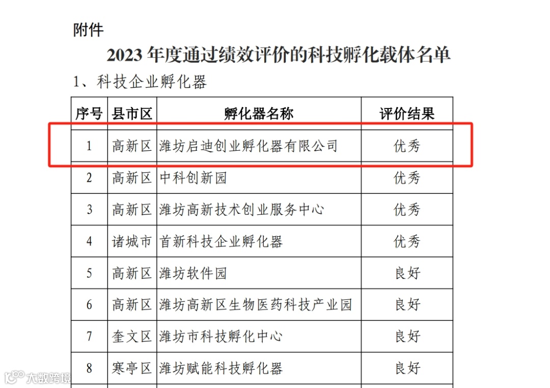 5月27日,潍坊市科技局发布了《关于2023年度科技孵化载体绩效评价结果的公示》,启迪之星(潍坊)孵化器获得“优秀”等级评价。