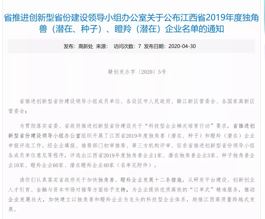 近日,江西省推进创新型省份建设领导小组办公室发布了《省推进创新型省份建设领导小组办公室关于公布江西省2019年度独角兽(潜在、种子)、瞪羚(潜在)企业名单的通知》。