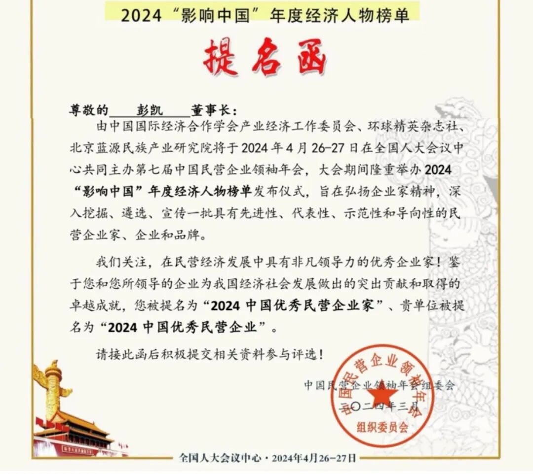 壹计划企业洲盾软件提名“2024中国优秀民营企业”,董事长彭凯提名“2024中国优秀民营企业家”