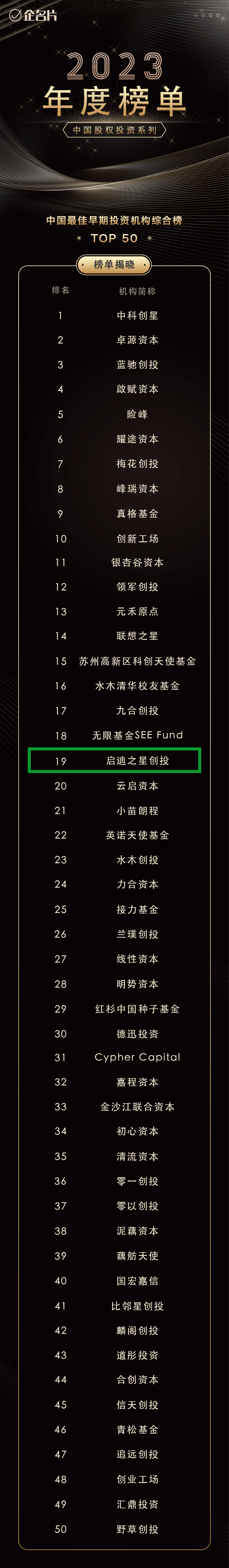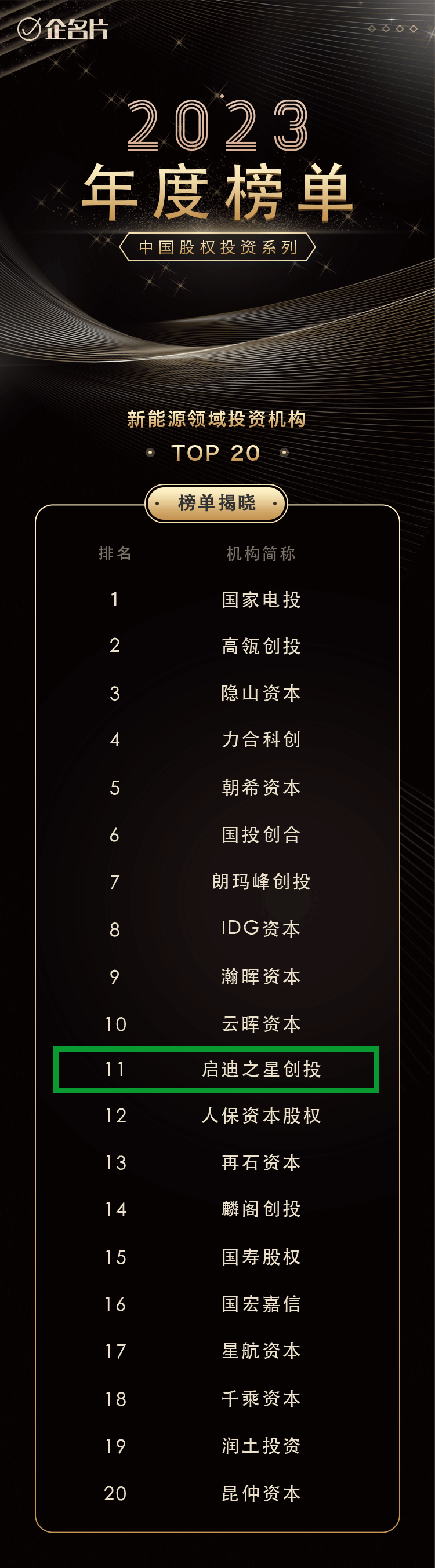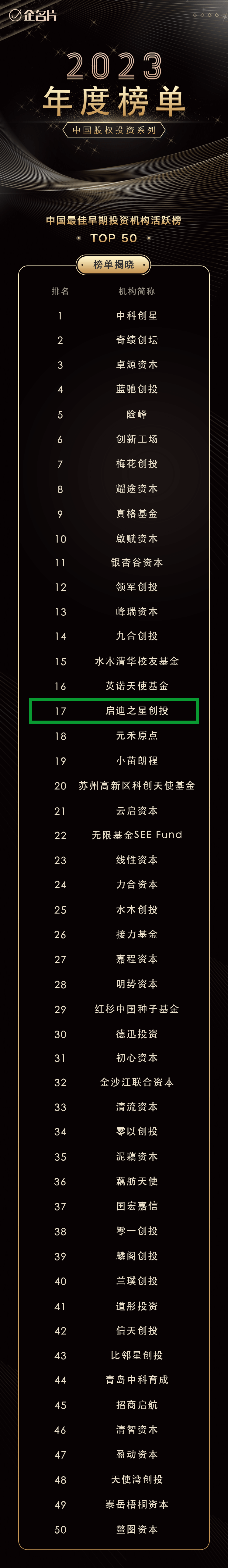 1月2日,企名片2023中国股权投资年度榜单正式发布。启迪之星创投同时入选「早期投资机构综合榜 TOP50」、「早期投资机构活跃榜 TOP50」、「新能源领域投资机构TOP20」。
