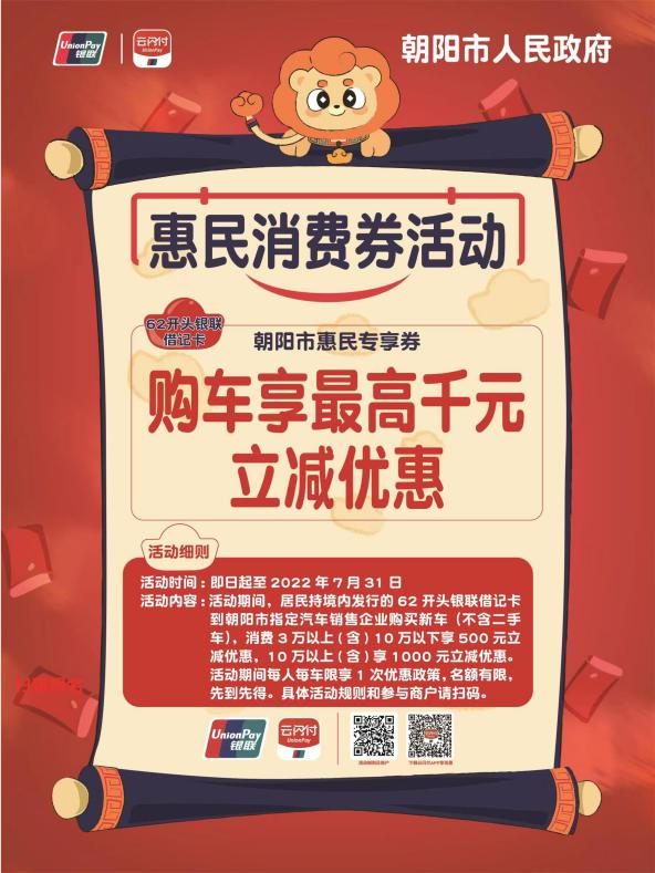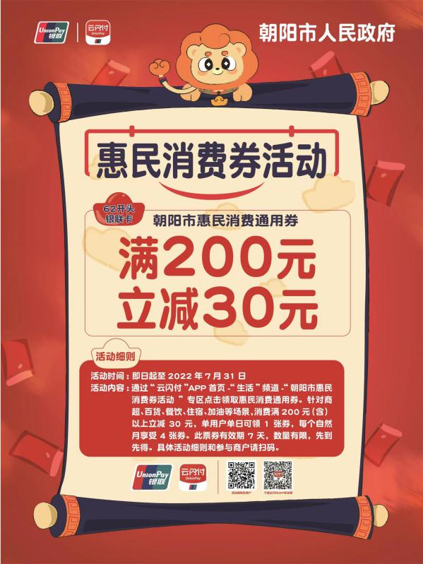 为拉动消费、促进经济平稳增长,结合“乐购朝阳 惠享美好”主题活动,朝阳市决定在全市范围内发放“惠民消费券”,全面覆盖到商超、百货、便利店、餐饮、家电、加油、汽车销售等商贸流通领域,针对各行业消费特点设置了满200减30全市通用券、满1000减50家电优惠券、500和1000两种面值的汽车专享券,多角度、立体化、全方位地将惠民消费券融入市民消费的各个环节当中去。市民持有参与活动银行银联卡并下载“云闪付”APP领取“惠民消费券”,可根据消费品类、所处县域、银行卡归属等,结合消费意愿自行选择最优方式、最优途径、最优组合,中国银联全力保障整个发放工作的公开公平公正。