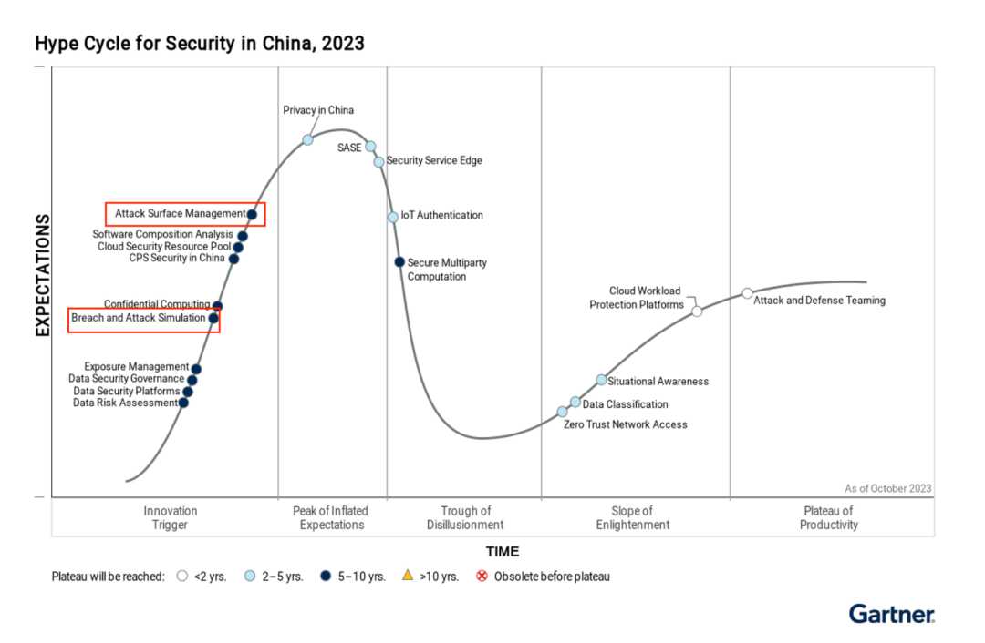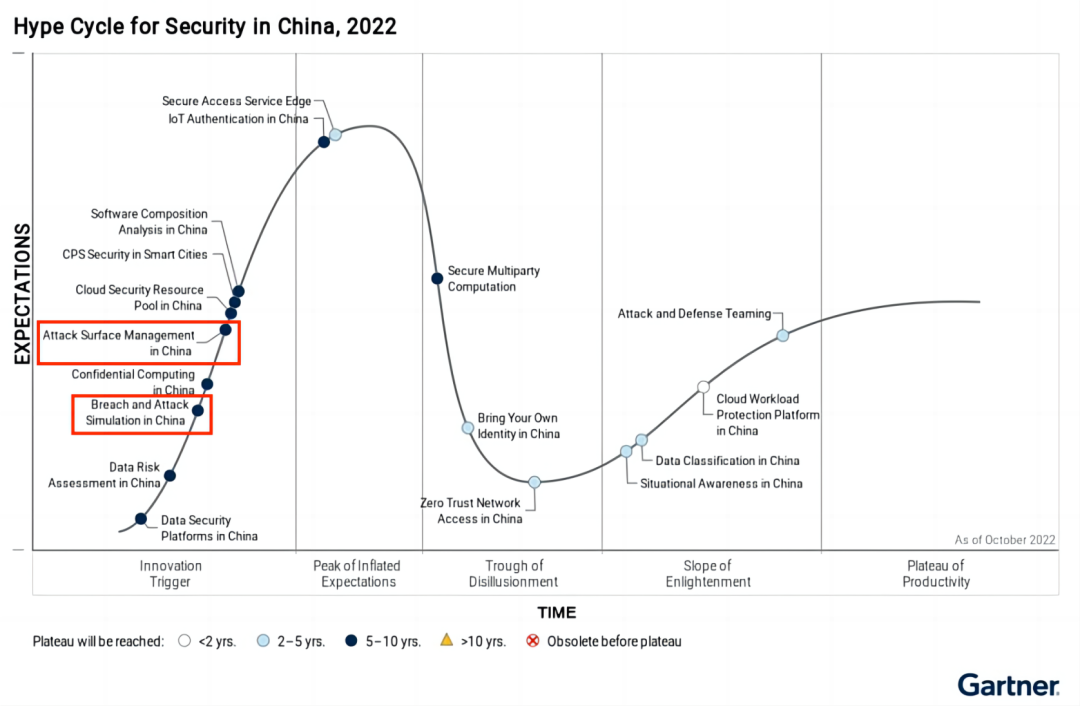国际权威研究机构Gartner发布的《2023中国安全技术成熟度曲线(Hype Cycle for Security in China,2023)》报告中,对2023年中国安全技术多个新兴领域的现状与发展趋势进行了分析。其中,矢安科技ASants凭借攻鉴(AS BAS)突破与攻击模拟系统的产品创新、技术优势和市场覆盖,在报告中被推荐为“入侵与攻击模拟”(BAS)领域代表厂商。技术成熟度曲线是Gartner评估行业前沿技术成熟度及市场发展趋势的图谱,旨在帮助客户客观判断技术潜力及使用价值。其中,矢安科技攻鉴(AS BAS)及觅影(AS EASM)两款产品所对应的的BAS及ASM领域在图谱中的位置相较于上一年度有明显提升,反映了这两类创新技术在技术发展和市场价值上逐渐成熟。▲2023年度中国安全技术成熟度曲线▲2022年度中国安全技术成熟度曲线