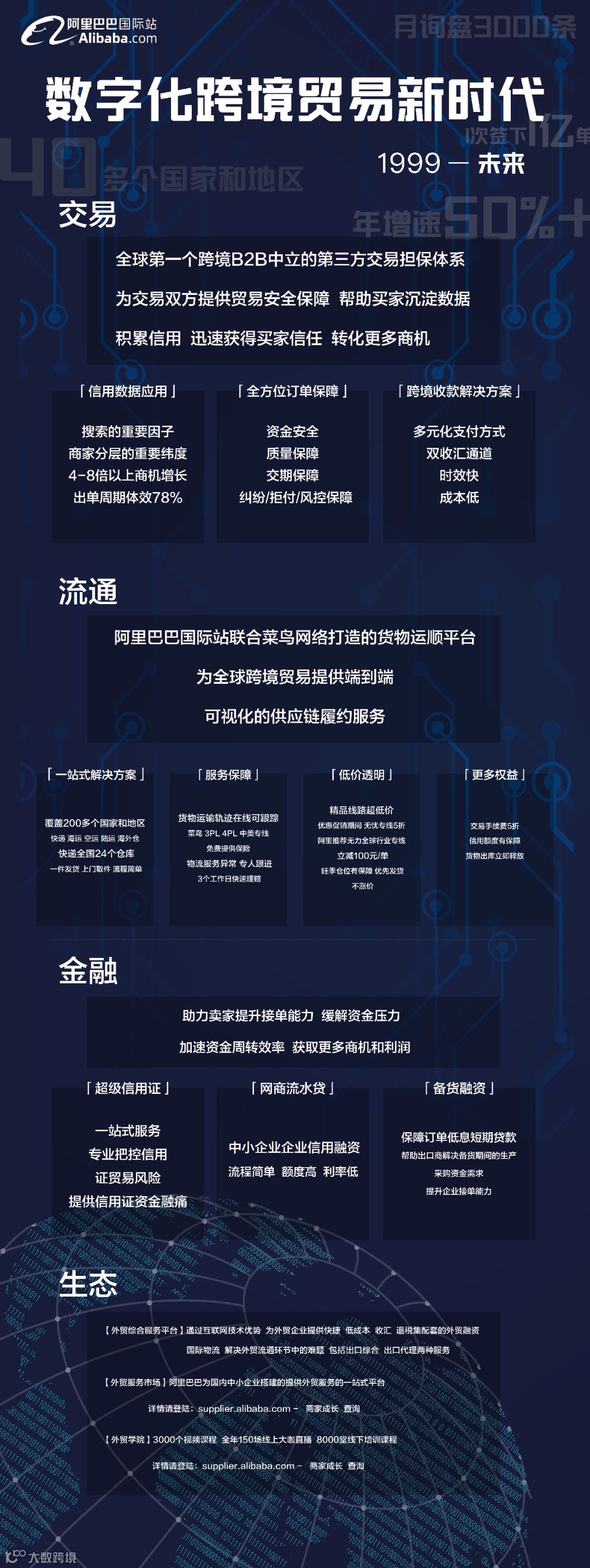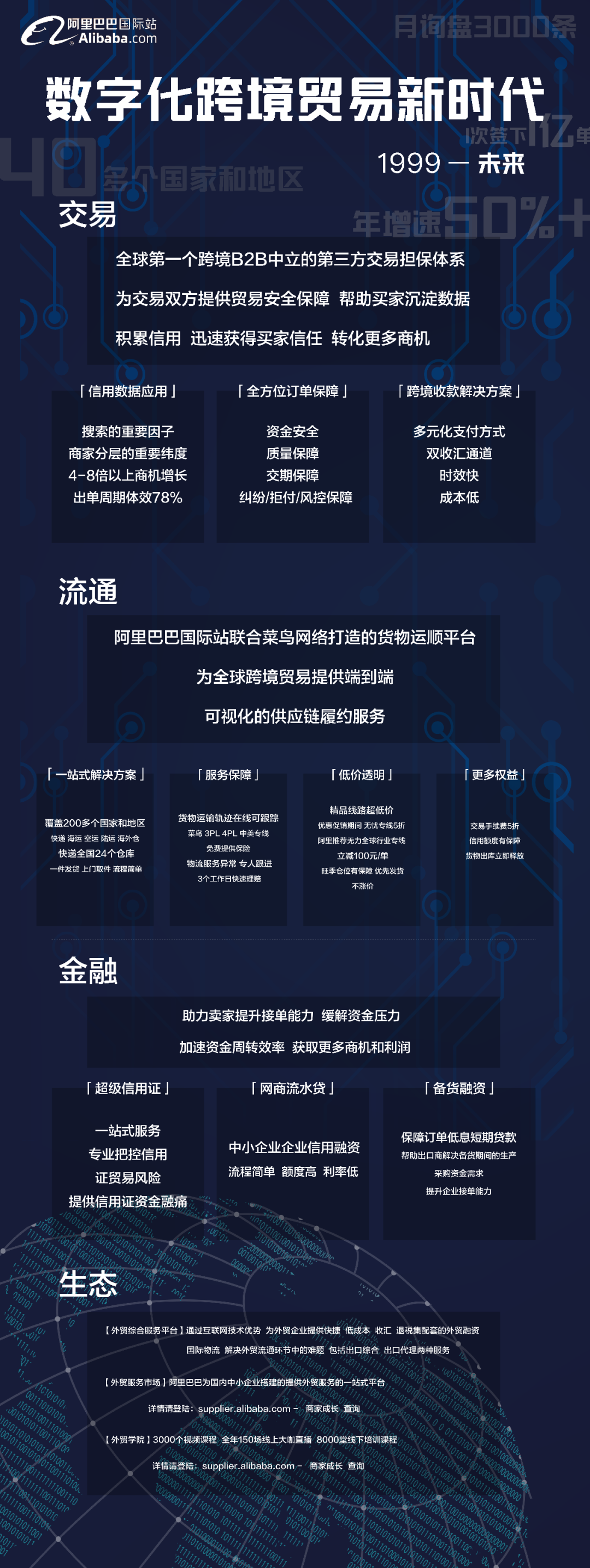 阿里巴巴国际站秉承客户第一的原则,始终伴随客户需求与跨境贸易趋势发展一同成长,是全球企业拓展跨境贸易蓝海的首选在线平台。
