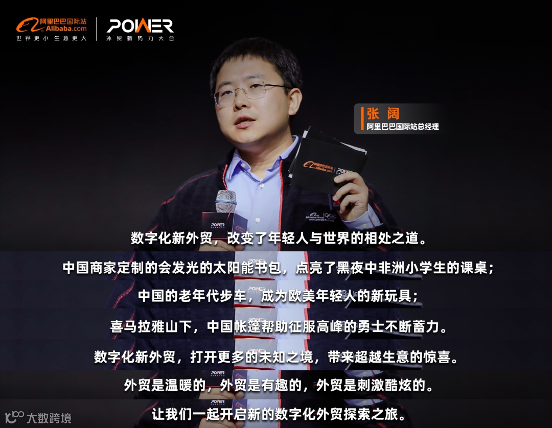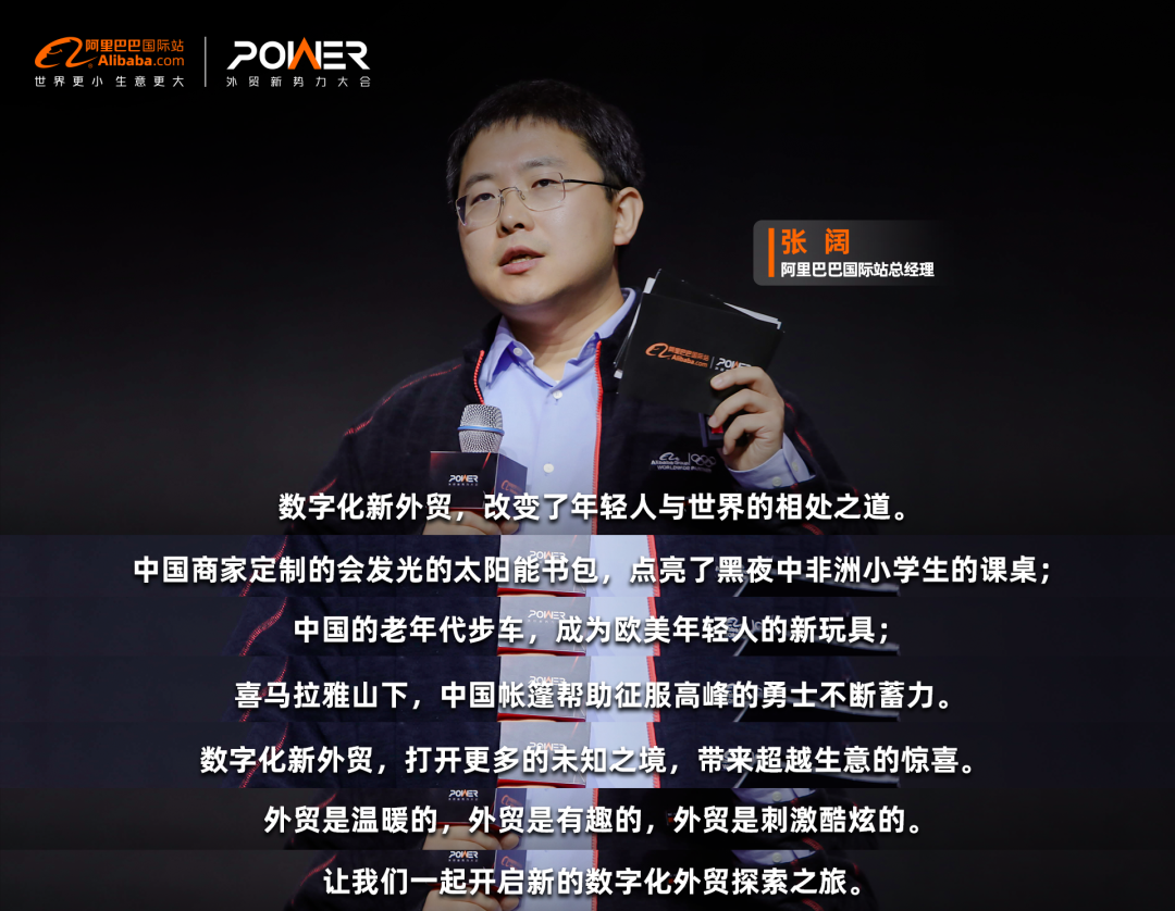 “数字化新外贸,改变了年轻人与世界的相处之道。中国商家定制的会发光的太阳能书包,点亮了黑夜中非洲小学生的课桌;中国的老年代步车,成为欧美年轻人的新玩具;喜马拉雅山下,中国帐篷帮助征服高峰的勇士不断蓄力。数字化新外贸,打开更多的未知之境,带来超越生意的惊喜。外贸是温暖的,外贸是有趣的,外贸是刺激酷炫的。让我们一起开启新的数字化外贸探索之旅。”