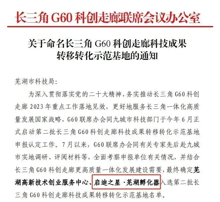 近日,长三角G60科创走廊联席会议办公室正式批文,启迪之星(芜湖)成功入选第二批长三角G60科创走廊科技成果转移转化示范基地名单。