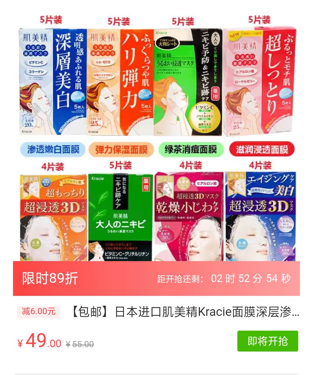 kracie肌美精深层美白浸透面膜,富含大量保湿、美白精华。其中维生素C抑制黑色素生成,防止晒后引起色斑;薏仁提取物可亮白肌肤;海洋胶原蛋白持久保湿补水;还添加柠檬酸,软化角质,令精华能够深层渗透,抵达皮肤底层。