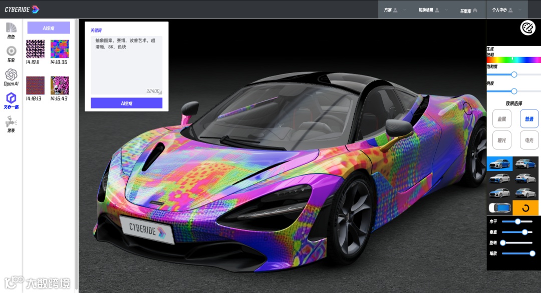 赛博锐3D仿真系统Beta版是一款基于AIGC的3D设计工具,可以为汽车外观快速生成样式内容,对车辆进行艺术个性化装饰美容。该版本可满足AI插件自然语言描述、3D细节编辑修改、在线3D预览分享、XR所见即所得四大业务场景。目前,该系统在微信小程序“视车元宇宙”中已支持百余款在售车型的个性化在线创作,其中,不乏蔚来ET7、问界M5等新款车型。