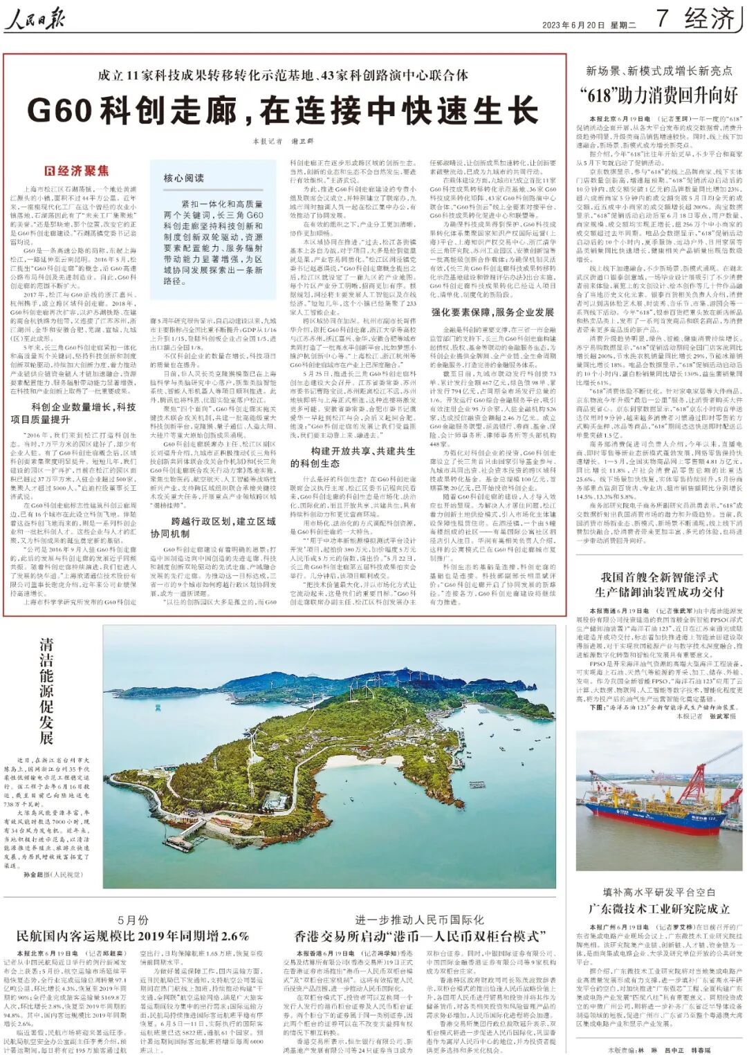 6月20日,《人民日报》报道关注“G60科创走廊”,认为“长三角G60科创走廊紧扣一体化和高质量两个关键词,坚持科技创新和制度创新双轮驱动,资源要素配置能力、服务辐射带动能力显著增强,为区域协同发展探索出一条新路径。”