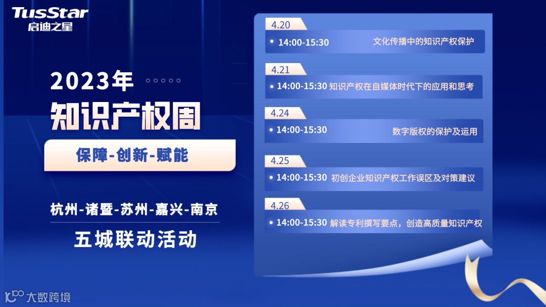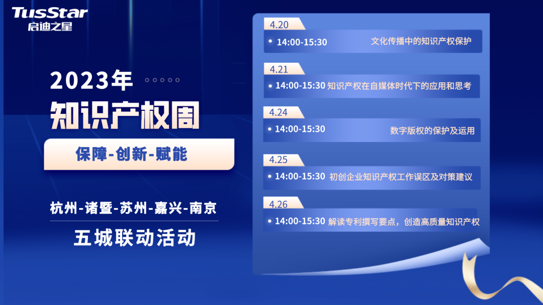 第23个世界知识产权日即将来临,4月20-26日,启迪之星长三角5基地——苏州、南京·麒麟、杭州、诸暨、嘉兴将协同开展主题活动。