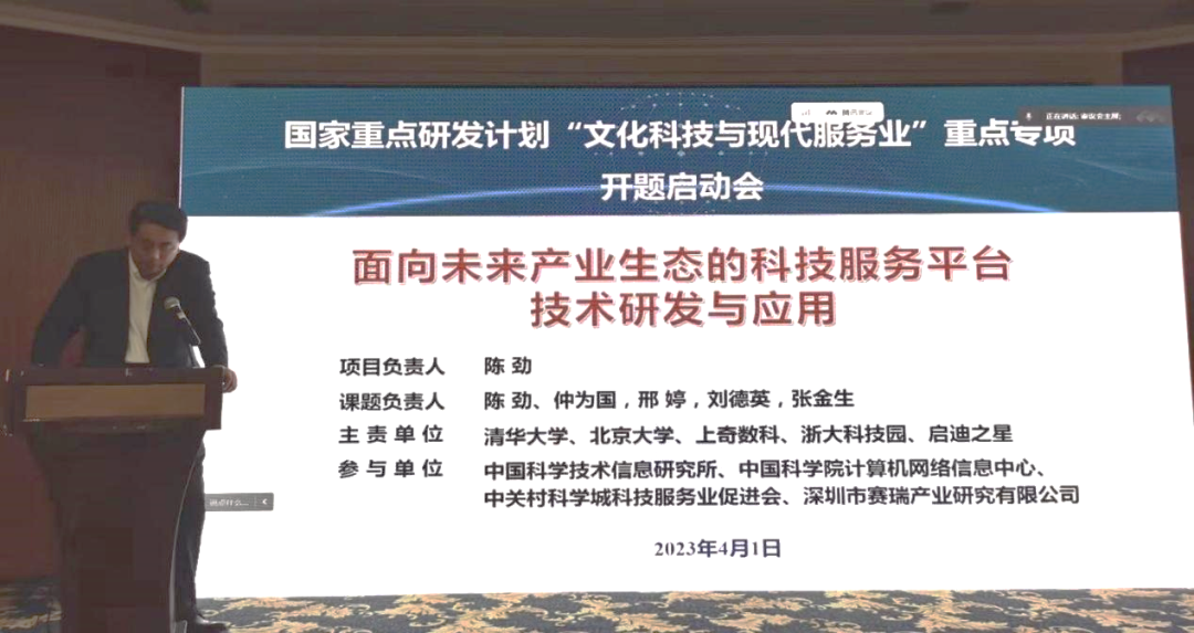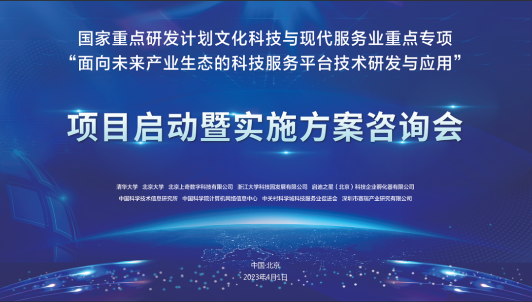4月1日,由清华大学、北京大学、北京上奇数字科技有限公司、浙江大学科技园发展有限公司、启迪之星(北京)科技企业孵化器有限公司、中国科学技术信息研究所、中国科学院计算机网络信息中心、中关村科学城科技服务业促进会、深圳市赛瑞产业研究有限公司等9家单位联合组织实施的国家重点研发计划文化科技与现代服务业重点专项“面向未来产业生态的科技服务平台技术研发与应用”项目启动暨实施方案咨询会在文津酒店召开。
