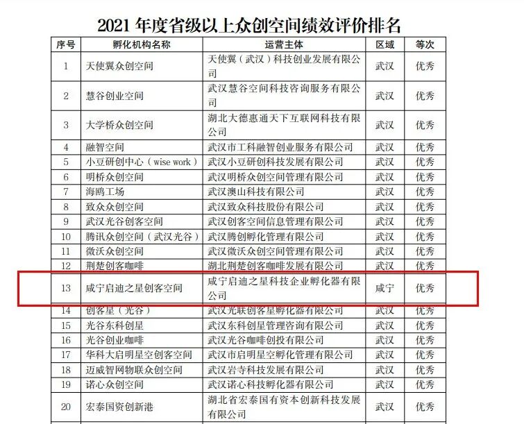 武汉市外唯一!启迪之星咸宁在湖北省众创空间绩效评价中获评优秀