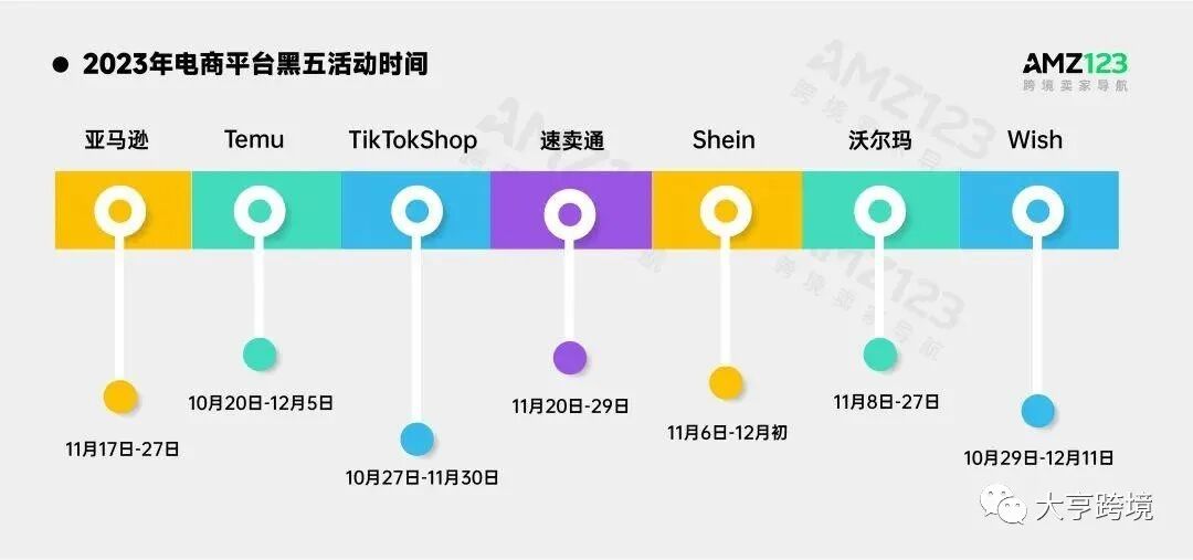 其中,Temu从10月20日就已进入“黑五”预热期,一直到12月5日持续一个月;Shein美国站活动从11月6日开始,持续至11月27日;TikTok Shop从10月27日开始,持续至11月30日;速卖通从11月20日开始,持续至11月29日,而Wish平台甚至昨天才结束活动。