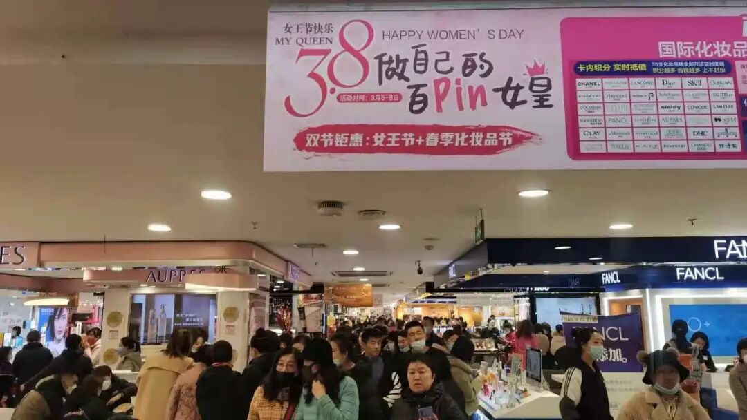 “这几天我们产品卖得特别好“,百盛购物中心一名护肤品销售员说。“三八节”促销期间,各类水乳、精华的销量大概能是平日里的两倍。据百盛购物中心市场部负责人朱先生介绍,今年商场首次将“三八节”促销与化妆品节促销同时进行,双节钜惠促进了销售额的大幅增长,全品类销售额同比增加了300%左右。化妆品品牌更是家家爆满,销售额占比超60%。