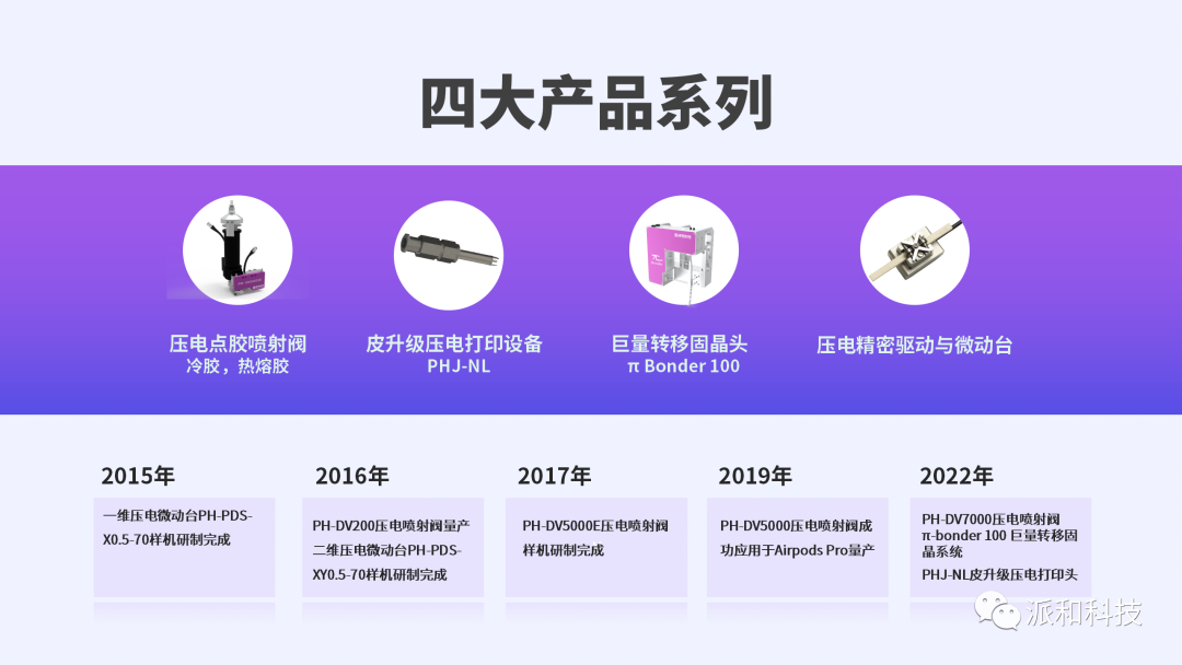 步入疫情时代,派和仍以时不我待的心态积极创新。2019年,派和为境外大客户蓝牙耳机量产过程中产生的工艺难题提供了切实可行的落地方案,实现了采用压电陶瓷高端点胶产品的进口替代。2022年,派和推出了采用压电陶瓷的高频高精度巨量转移技术,同年又推出了第一台皮升级生物医用压电打印头。