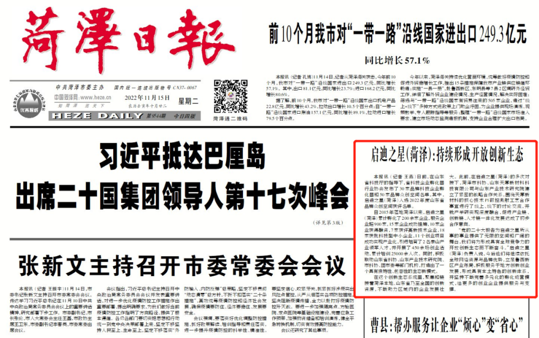 编注:近日,《菏泽日报》头版发布了《启迪之星(菏泽):持续形成开放创新生态》,就启迪之星(菏泽)自落地将近8年以来的发展及未来规划进行专题报道。自2015年落地菏泽以来,启迪之星(菏泽)累计孵化了200余家企业,服务企业超900家,并开展了450余场创业活动,累计培训25000余人次。下文是相关报道,点击文末“阅读原文”可查看报道原出处。