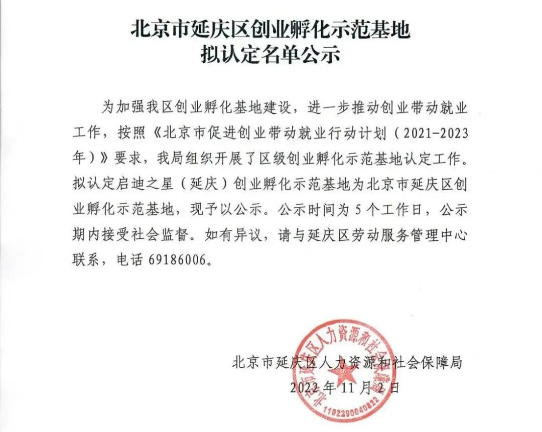 启迪之星(延庆)获评北京市延庆区创业孵化示范基地认定