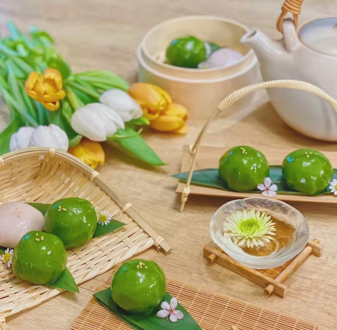 青团:是用浆麦草或者艾草捣烂挤压出汁,再用糯米粉拌匀揉和做成的,颜色绿得十分好看。团中心包着各种馅,风味多样,趁热吃时,口感会更佳!