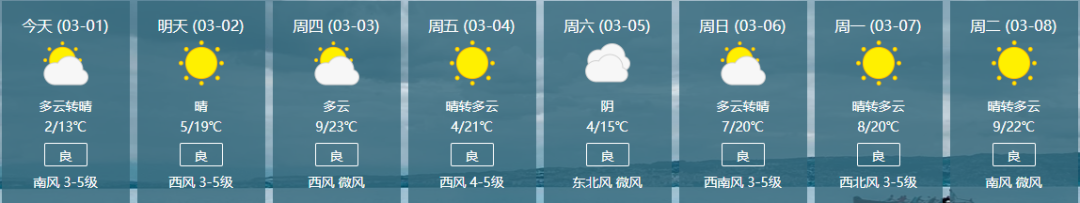 3月1日,全省晴天间多云。白天全省西北风或偏北风4级左右,中西部、北部局地阵风7到8级。全省大部分地区最高气温较前期下降6到8度。