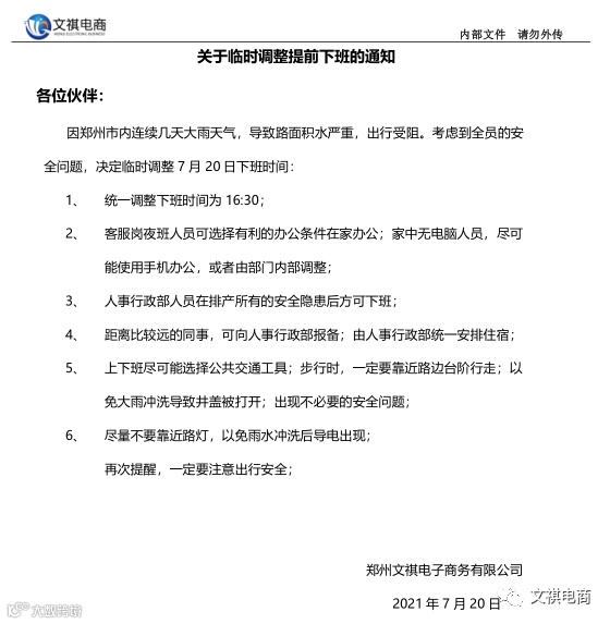 员工安全第一,面对暴雨洪涝灾害,公司第一时间安排酒店,统计住宿名单,抢先安置员工。人事电话回访周边回家的每一名员工,确保安全到家。