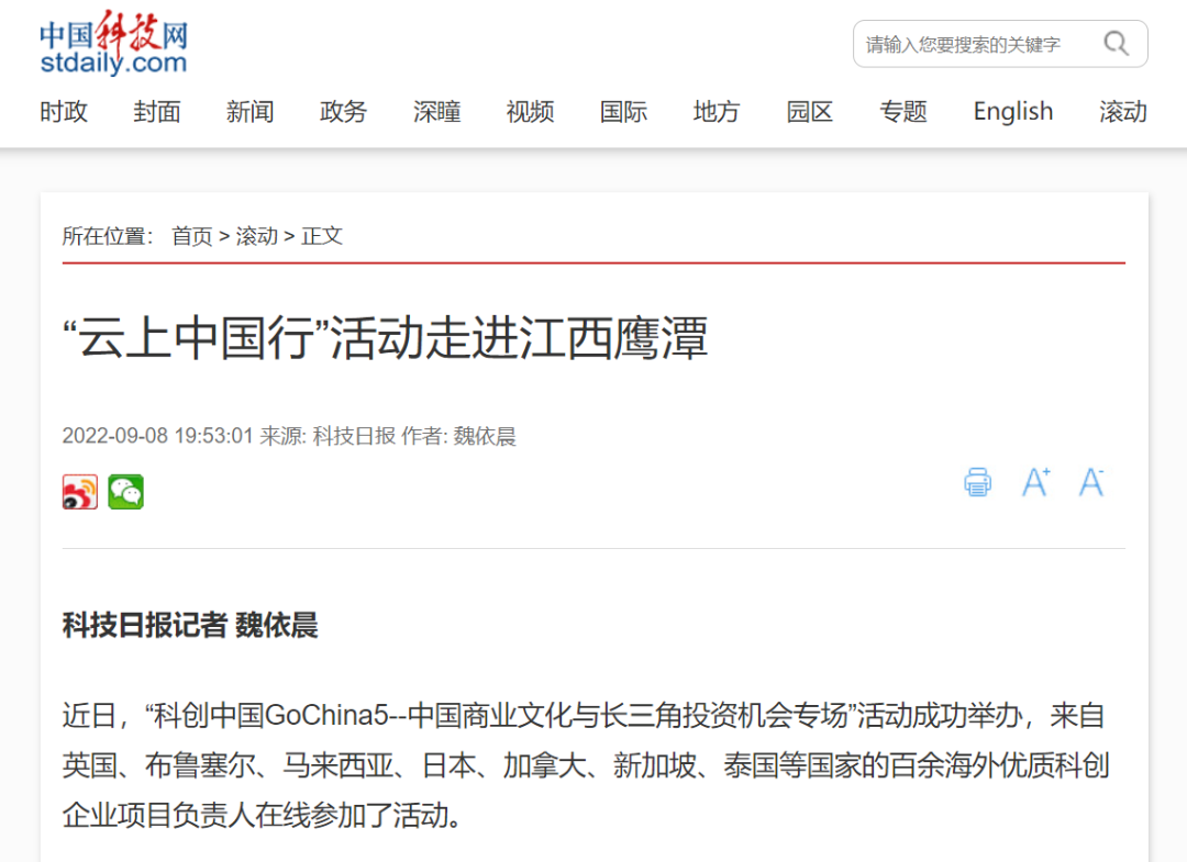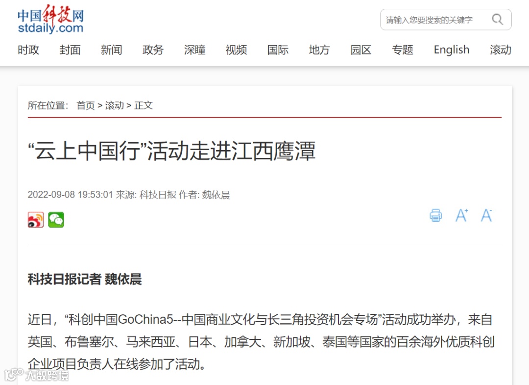 编注:为帮助海外科创项目了解中国区域特色,协助海外优质企业匹配中国创新资源,推动中外多边科创合作,启迪之星“GoChina5——中国商业文化与长三角投资机会专场”活动成功举办,百余位海外优质科创企业项目负责人在线参加了活动。活动受到了科技日报“中国科技网”的关注和报道。