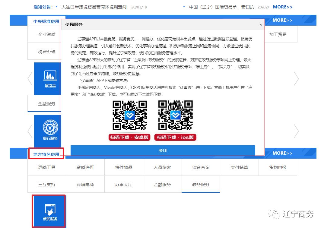 为了保障人员有序流动,打通人流、物流赌点,恢复经济社会秩序,提高公众跨地区出行便利度,公众可在中国(辽宁)国际贸易单一窗口【地方特色应用-便民服务】中扫码下载“辽事通”APP,并获取个人“健康码”,以实现跨地区人员健康认证互通互认。