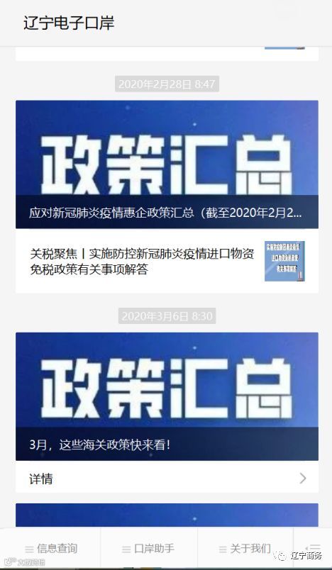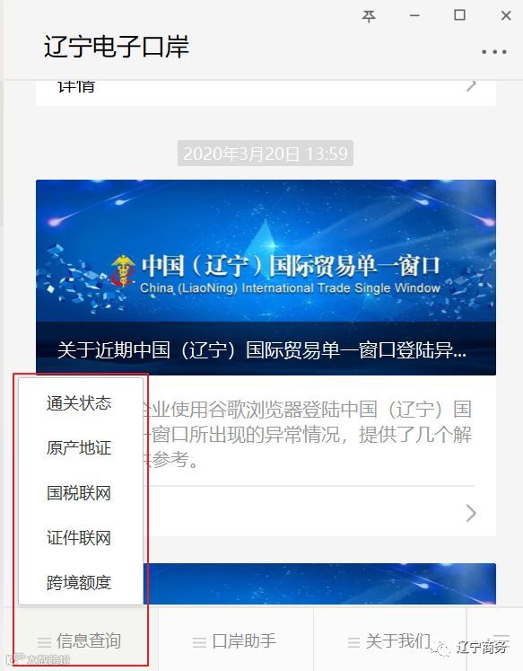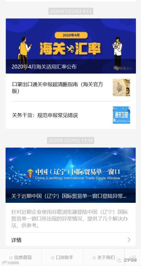 另外,企业也可通过中国(辽宁)国际贸易单一窗口公众号,点击【信息查询】即可快速获取相关信息。