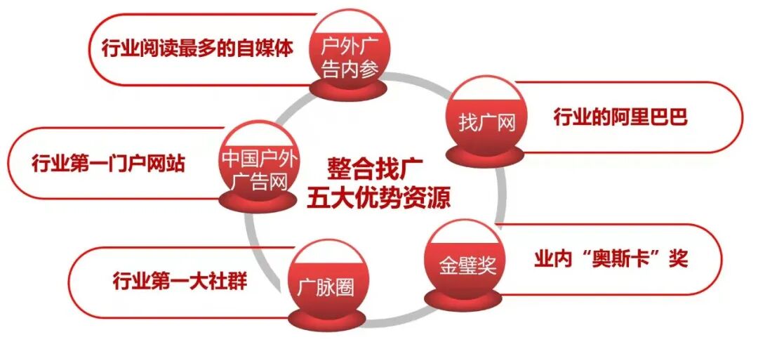 目前找广旗下有户外广告行业粉丝最多的自媒体矩阵:户外广告内参;行业第一门户网站:中国户外广告网;行业第一大社群:广脉圈;户外广告行业的阿里巴巴:找广网;行业的奥斯卡奖:金璧奖.中国户外媒体创新大会等。