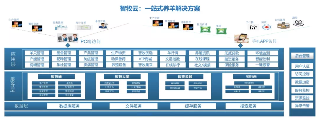 中科智牧基于人工智能、物联网、大数据技术研发及应用,研发出一套可适用于绵羊和山羊养殖的数字化智慧养殖管理平台--智牧通,涵盖智慧养殖管理系统(智牧通软件系统)、溯源管理系统、物资商场管理系统、智能环控系统、企业运营监测大数据分析平台、政府畜牧监测大数据等多场景应用。