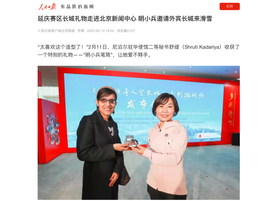 编注:2月13日,人民日报客户端以《延庆赛区长城礼物走进北京新闻中心 明小兵邀请外宾长城来滑雪》为题报道了“长城礼物”文创产品在冬奥期间大放异彩,搭起中外文化交流的桥梁。