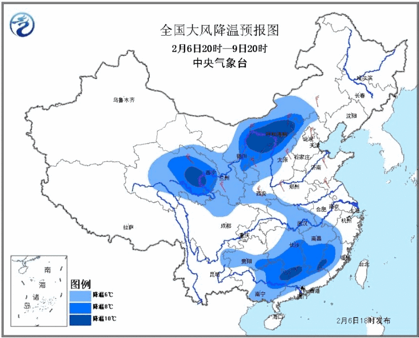中央气象台预计,6日夜间至9日,我国中东部大部地区都将自北向南将先后出现大范围大风降温和雨雪天气,平均气温将普遍下降4℃以上,其中,青海东部、陕西北部、内蒙古中部、山西北部、贵州东南部、湖南中南部、江西中南部、福建西部、广西北部和广东北部等地气温将下降8℃以上,局地超过10℃!长江以北地区并伴有4~6级偏北风,东部和南部海区风力有7~9级。